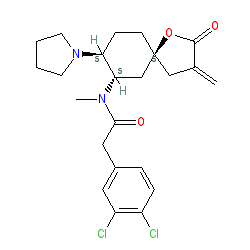| SMILES | C=C1C[C@]2(CC[C@H](N3CCCC3)[C@@H](N(C)C(=O)Cc3ccc(Cl)c(Cl)c3)C2)OC1=O |