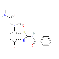 | SMILES | CNC(=O)CN(C(C)=O)c1ccc(OC)c2nc(NC(=O)c3ccc(F)cc3)sc12 |