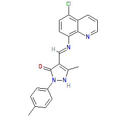 | SMILES | Cc1ccc(-n2[nH]c(C)c(C=Nc3ccc(Cl)c4cccnc34)c2=O)cc1 |