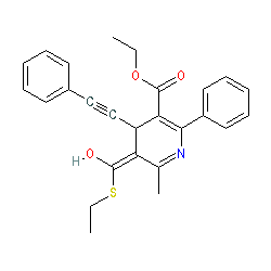 | SMILES | CCOC(=O)C1=C(c2ccccc2)N=C(C)/C(=C(/O)SCC)C1C#Cc1ccccc1 |