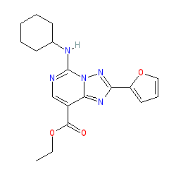 | SMILES | CCOC(=O)c1cnc(NC2CCCCC2)n2nc(-c3ccco3)nc12 |