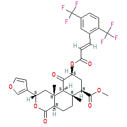 | SMILES | COC(=O)[C@@H]1C[C@H](OC(=O)/C=C/c2cc(C(F)(F)F)ccc2C(F)(F)F)C(=O)[C@H]2[C@@]1(C)CC[C@H]1C(=O)O[C@H](c3ccoc3)C[C@]21C |