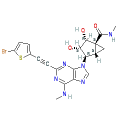 | SMILES | CNC(=O)[C@@]12C[C@@H]1[C@@H](n1cnc3c(NC)nc(C#Cc4ccc(Br)s4)nc31)[C@H](O)[C@@H]2O |
