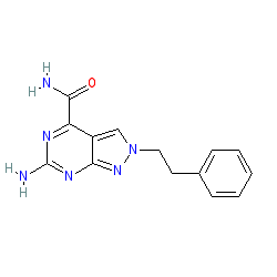 | SMILES | NC(=O)c1nc(N)nc2nn(CCc3ccccc3)cc12 |