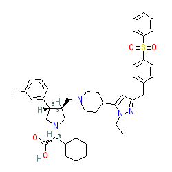 | SMILES | CCn1nc(Cc2ccc(S(=O)(=O)c3ccccc3)cc2)cc1C1CCN(C[C@H]2CN([C@@H](C(=O)O)C3CCCCC3)C[C@@H]2c2cccc(F)c2)CC1 |
