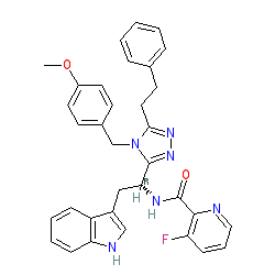 | SMILES | COc1ccc(Cn2c(CCc3ccccc3)nnc2[C@@H](Cc2c[nH]c3ccccc23)NC(=O)c2ncccc2F)cc1 |