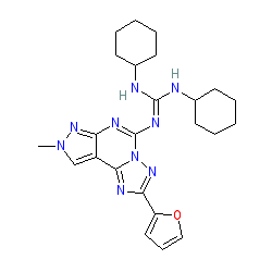 | SMILES | Cn1cc2c(nc(N=C(NC3CCCCC3)NC3CCCCC3)n3nc(-c4ccco4)nc23)n1 |