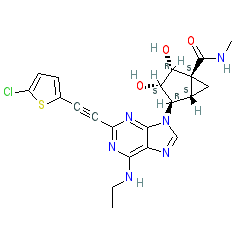| SMILES | CCNc1nc(C#Cc2ccc(Cl)s2)nc2c1ncn2[C@H]1[C@H](O)[C@H](O)[C@]2(C(=O)NC)C[C@H]12 |