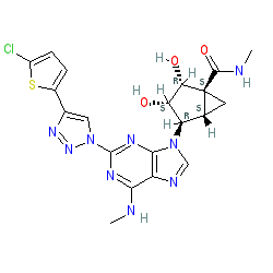 | SMILES | CNC(=O)[C@@]12C[C@@H]1[C@@H](n1cnc3c(NC)nc(-n4cc(-c5ccc(Cl)s5)nn4)nc31)[C@H](O)[C@@H]2O |