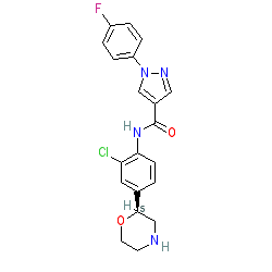 | SMILES | O=C(Nc1ccc([C@H]2CNCCO2)cc1Cl)c1cnn(-c2ccc(F)cc2)c1 |