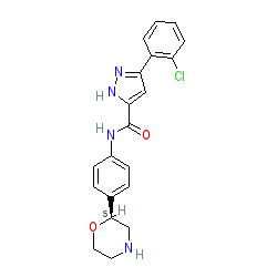 | SMILES | O=C(Nc1ccc([C@H]2CNCCO2)cc1)c1cc(-c2ccccc2Cl)n[nH]1 |