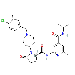 | SMILES | CCC(C)NC(=O)c1cc(C)nc(NC(=O)[C@H]2CCC(=O)N2C2CCN(Cc3ccc(Cl)c(C)c3)CC2)c1 |