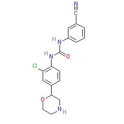 | SMILES | N#Cc1cccc(NC(=O)Nc2ccc(C3CNCCO3)cc2Cl)c1 |