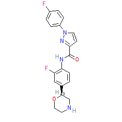 | SMILES | O=C(Nc1ccc([C@H]2CNCCO2)cc1F)c1ccn(-c2ccc(F)cc2)n1 |
