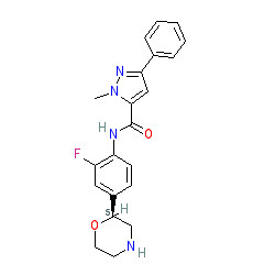 | SMILES | Cn1nc(-c2ccccc2)cc1C(=O)Nc1ccc([C@H]2CNCCO2)cc1F |