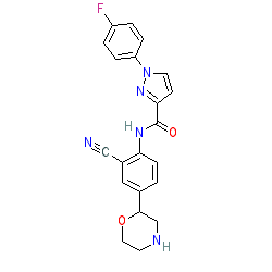 | SMILES | N#Cc1cc(C2CNCCO2)ccc1NC(=O)c1ccn(-c2ccc(F)cc2)n1 |