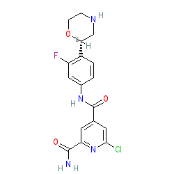 | SMILES | NC(=O)c1cc(C(=O)Nc2ccc([C@H]3CNCCO3)c(F)c2)cc(Cl)n1 |