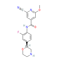 | SMILES | COc1cc(C(=O)Nc2ccc([C@H]3CNCCO3)cc2F)cc(C#N)n1 |
