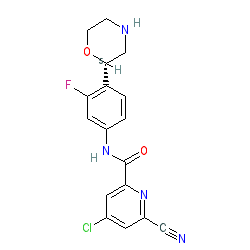 | SMILES | N#Cc1cc(Cl)cc(C(=O)Nc2ccc([C@H]3CNCCO3)c(F)c2)n1 |