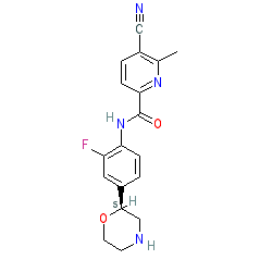 | SMILES | Cc1nc(C(=O)Nc2ccc([C@H]3CNCCO3)cc2F)ccc1C#N |