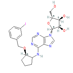 | SMILES | OC[C@H]1O[C@@H](n2cnc3c(NC4CCC[C@H]4OCc4cccc(I)c4)ncnc32)[C@H](O)[C@@H]1O |