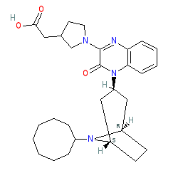 | SMILES | O=C(O)CC1CCN(c2nc3ccccc3n([C@@H]3C[C@@H]4CC[C@H](C3)N4C3CCCCCCC3)c2=O)C1 |