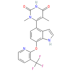 | SMILES | Cc1c(-c2ccc(Oc3ncccc3C(F)(F)F)c3[nH]ccc23)n(C)c(=O)[nH]c1=O |