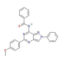| SMILES | COc1ccc(-c2nc(NC(=O)c3ccccc3)c3nn(-c4ccccc4)cc3n2)cc1 |