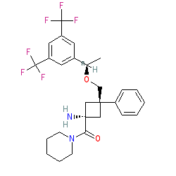 | SMILES | C[C@@H](OC[C@]1(c2ccccc2)C[C@](N)(C(=O)N2CCCCC2)C1)c1cc(C(F)(F)F)cc(C(F)(F)F)c1 |