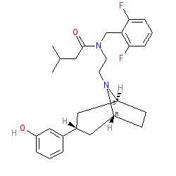 | SMILES | CC(C)CC(=O)N(CCN1[C@H]2CC[C@@H]1C[C@H](c1cccc(O)c1)C2)Cc1c(F)cccc1F |