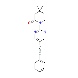 | SMILES | CC1(C)CCN(c2ncc(C#Cc3ccccc3)cn2)C(=O)C1 |