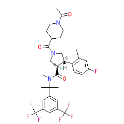 | SMILES | CC(=O)N1CCC(C(=O)N2C[C@H](c3ccc(F)cc3C)[C@@H](C(=O)N(C)C(C)(C)c3cc(C(F)(F)F)cc(C(F)(F)F)c3)C2)CC1 |