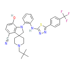 | SMILES | CC(C)(C)CN1CCC2(CC1)CN(c1ccccc1Nc1nnc(-c3ccc(C(F)(F)F)cc3)s1)c1c(O)ccc(C#N)c12 |