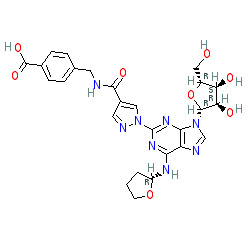 | SMILES | O=C(O)c1ccc(CNC(=O)c2cnn(-c3nc(N[C@H]4CCCO4)c4ncn([C@@H]5O[C@H](CO)[C@@H](O)[C@H]5O)c4n3)c2)cc1 |