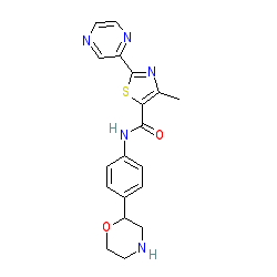 | SMILES | Cc1nc(-c2cnccn2)sc1C(=O)Nc1ccc(C2CNCCO2)cc1 |