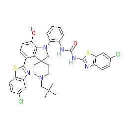 | SMILES | CC(C)(C)CN1CCC2(CC1)CN(c1ccccc1NC(=O)Nc1nc3ccc(Cl)cc3s1)c1c(O)ccc(-c3nc4cc(Cl)ccc4s3)c12 |