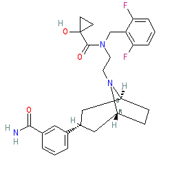 | SMILES | NC(=O)c1cccc([C@@H]2C[C@@H]3CC[C@H](C2)N3CCN(Cc2c(F)cccc2F)C(=O)C2(O)CC2)c1 |