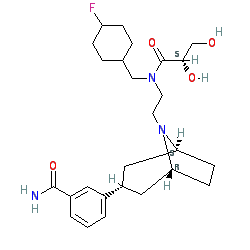 | SMILES | NC(=O)c1cccc([C@@H]2C[C@@H]3CC[C@H](C2)N3CCN(CC2CCC(F)CC2)C(=O)[C@@H](O)CO)c1 |