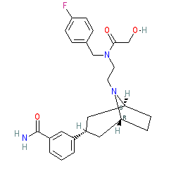 | SMILES | NC(=O)c1cccc([C@@H]2C[C@@H]3CC[C@H](C2)N3CCN(Cc2ccc(F)cc2)C(=O)CO)c1 |