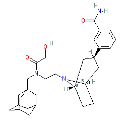 | SMILES | NC(=O)c1cccc([C@@H]2C[C@@H]3CC[C@H](C2)N3CCN(CC23CC4CC(CC(C4)C2)C3)C(=O)CO)c1 |