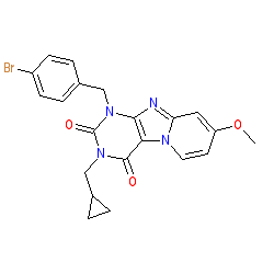 | SMILES | COc1ccn2c(c1)nc1c2c(=O)n(CC2CC2)c(=O)n1Cc1ccc(Br)cc1 |