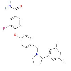 | SMILES | Cc1cc(C)cc(C2CCCN2Cc2ccc(Oc3ccc(C(N)=O)cc3F)cc2)c1 |