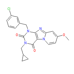 | SMILES | COc1ccn2c(c1)nc1c2c(=O)n(CC2CC2)c(=O)n1Cc1cccc(Cl)c1 |