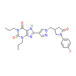 | SMILES | CCCn1c(=O)c2[nH]c(-c3cnn(CC4CC(=O)N(c5ccc(F)cc5)C4)c3)nc2n(CCC)c1=O |