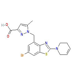 | SMILES | Cc1cc(C(=O)O)nn1Cc1cc(Br)cc2sc(N3CC=CCC3)nc12 |