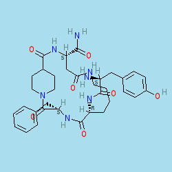 | SMILES | NC(=O)[C@@H]1CC(=O)NCCCC[C@@H](NC(=O)[C@@H](N)Cc2ccc(O)cc2)C(=O)N[C@@H](Cc2ccccc2)C(=O)N2CCC(CC2)C(=O)N1 |