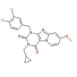| SMILES | COc1ccn2c(c1)nc1c2c(=O)n(CC2CC2)c(=O)n1Cc1ccc(Cl)c(Cl)c1 |