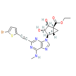 | SMILES | CCOC(=O)[C@@]12C[C@@H]1[C@@H](n1cnc3c(NC)nc(C#Cc4ccc(Br)s4)nc31)[C@H](O)[C@@H]2O |