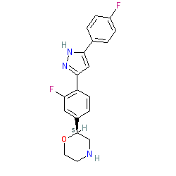 | SMILES | Fc1ccc(-c2cc(-c3ccc([C@H]4CNCCO4)cc3F)n[nH]2)cc1 |