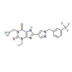 | SMILES | CCn1c(=O)n(CC2CC2)c(=O)c2[nH]c(-c3cnn(Cc4cccc(C(F)(F)F)c4)c3)nc21 |